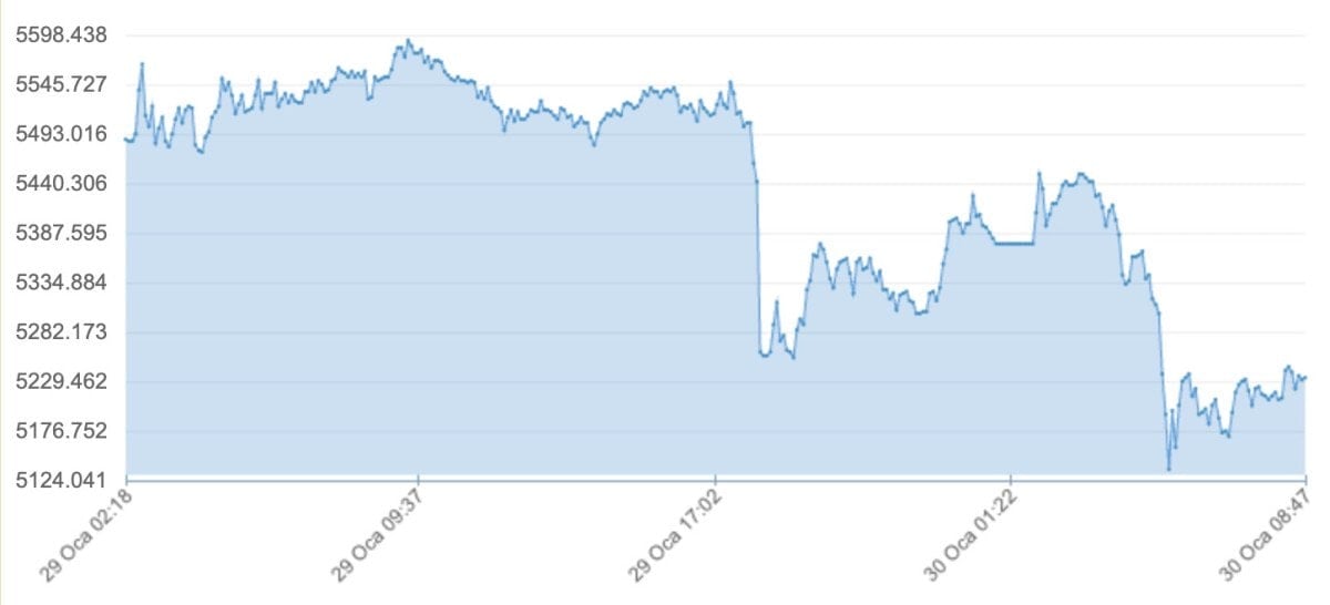 Ons altın, dünkü 5 bin 598 seviyesinden önce 5 bin 105 dolara geriledi. Ons altın, yeni günde ise yüzde 3,3 düşüşle 5 bin 218 dolarda bulunuyor ve şu anda dünkü seviyesinin hala altında.