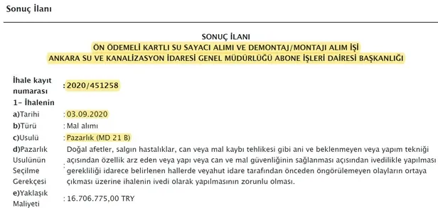 Ankara Büyükşehir Belediyesi iştiraki Ankara Su ve Kanalizasyon İdaresi (ASKİ) Genel Müdürlüğü Abone İşleri Dairesi Başkanlığı tarafından 18 Ağustos 2020 tarihinde açık ihale yapıldığı bildirildi. İhalenin su sayacı alımı olduğu öğrenildi. İhalede 80 bin su sayacının alımı, 30 bin adet su sayacının sökümünün yapılacağı ifade edildi. Kamu İhale Kurumu; Ankara Büyükşehir Belediyesi’nin söz konusu ihalesini iptal ettiği öğrenildi. İhale; ön ödemeli kartlı su sayacı alımı ve demontaj/montajı alım işinin yeterlilik kriterlerine ve ihale dokümanında belirtilen şartlara uygun teklif verilmediğinden ve yaklaşık maliyetin üzerinde teklif verildiğinden iptal edildi.