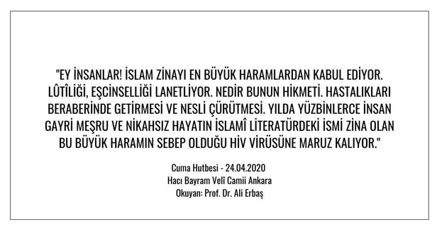 Prof. Dr. Ali Erbaş hutbesinde; “Ey insanlar! İslam zinayı en büyük haramlardan kabul ediyor. Lûtîliği, Eşcinselliği lanetliyor. Nedir bunun hikmeti. Hastalıkları beraberinde getirmesi ve nesli çürütmesidir, bunun hikmeti. Yılda yüzbinlerce insan gayri meşru ve nikahsız hayatın islamî literatürdeki ismi zina olan bu büyük haramın sebep olduğu Hiv virüsüne maruz kalıyor. Geliniz bu tür kötülüklerden insanları korumak için birlikte mücadele edelim” ifadelerini kullandı.