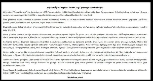 İnsan Hakları Derneği (İHD); Diyanet İşleri Başkanı Prof. Dr. Ali Erbaş hakkında suç duyurusunda bulundu.