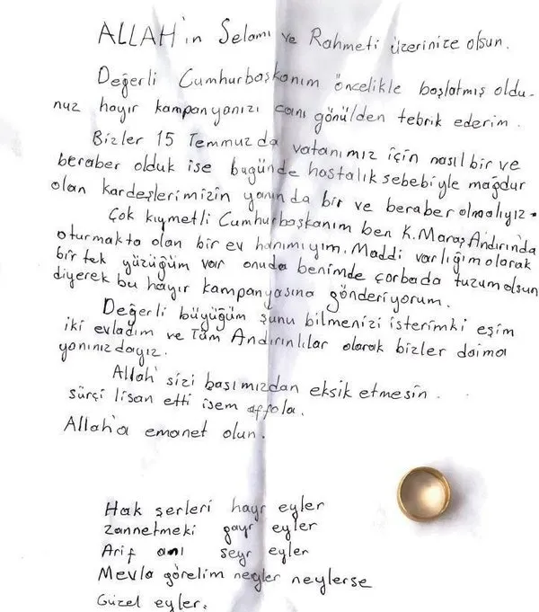 Öksüz yüzüğüyle beraber Cumhurbaşkanı Erdoğan’a hitaben gönderdiği mektupta, “Bizler 15 Temmuz’da vatanımız için nasıl bir ve beraber olduysak bugün de hastalık sebebiyle mağdur olan kardeşlerimizin yanında bir ve beraber olmalıyız. Maddi varlığım olarak bir tek yüzüğüm var. Onu da çorbada benim de tuzum olsun diyerek bu hayır kampanyasına gönderiyorum.” ifadelerini kullanmıştı.