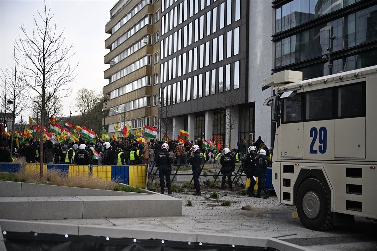 Suriye ordusunun başarılı operasyonları sonrası yuvalandıkları bölgelerden temizlenen SDG/YPG’nin yandaşları, ellerindeki paçavralar ile Avrupa Parlamentosu önünde toplanınca Brüksel polisinden sert müdahale geldi..