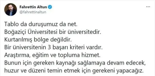 İletişim Başkanı Altun, Twitter hesabından Boğaziçi Üniversitesi’ndeki eylemlerle ilgili açıklama yaptı. Paylaşımında, eylemde gözaltına alınan 108 kişiden sadece 7’sinin üniversite öğrencisi olduğuna dair habere de yer veren Altun, “Tabloda duruşumuz da net. Boğaziçi Üniversitesi bir üniversitedir. Kurtarılmış bölge değildir. Bir üniversitenin üç başarı kriteri vardır; araştırma, eğitim ve topluma hizmet. Bunun için gereken kaynağı sağlamaya devam edecek, huzur ve düzeni temin etmek için gerekeni yapacağız” ifadelerini kullandı.