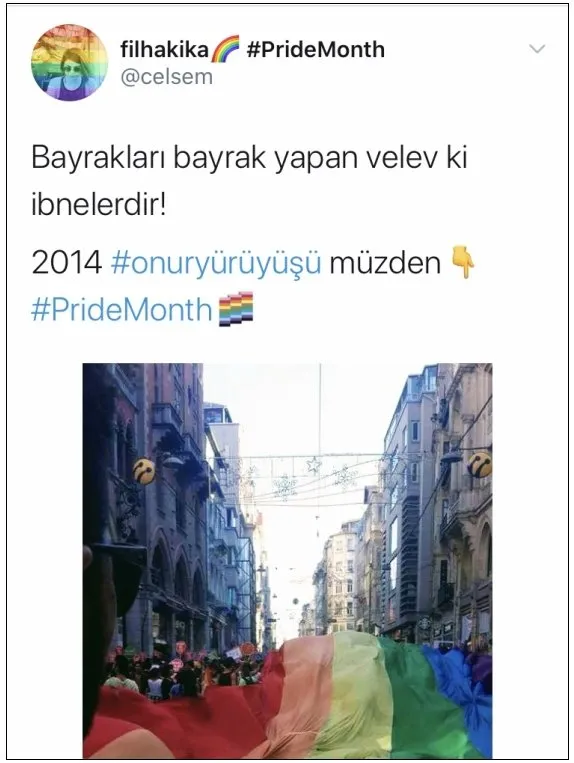 Semra Çelebi, sosyal paylaşım sitesi Twitter’daki şahsi hesabından paylaşımda bulundu ve “Bayrakları bayrak yapan velev ki ibnelerdir! 2014 #onuryürüyüşümüzden #PrideMonth” ifadelerini kullandı.
