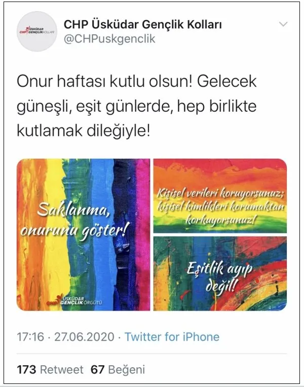 CHP Üsküdar Gençlik Kolları da; Twitter hesabından eşcinsel sapkınlık projesi LGBT’ye destek verdi ve “Onur haftası kutlu olsun! Gelecek güneşli, eşit günlerde, hep birlikte kutlamak dileğiyle!” ifadelerini kullandı.