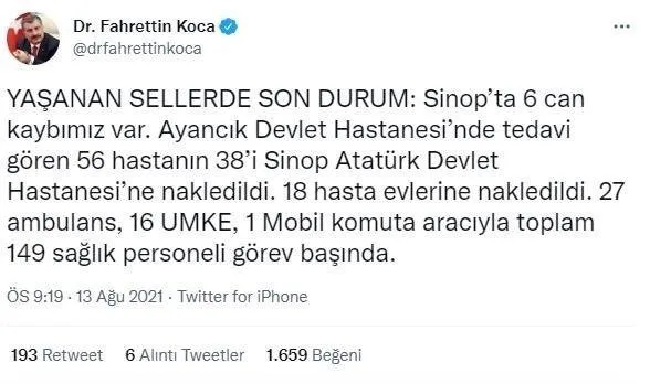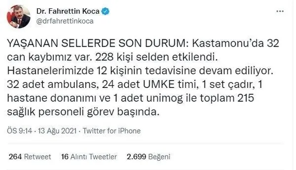 Sağlık Bakanı Fahrettin Koca, Kastamonu, Sinop ve Bartın’da meydana gelen sel felaketi sonucunda “Kastamonu’da 32 can kaybımız var. 228 kişi selden etkilendi. Hastanelerimizde 12 kişinin tedavisine devam ediliyor” diyerek son durumu paylaştı.