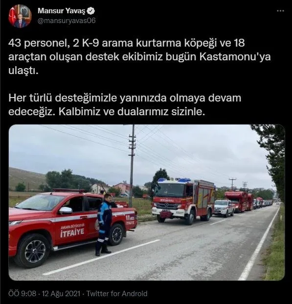 Yavaş ise “43 personel, 2 K-9 arama kurtarma köpeği ve 18 araçtan oluşan destek ekibimiz bugün Kastamonu’ya ulaştı. Her türlü desteğimizle yanınızda olmaya devam edeceğiz. Kalbimiz ve dualarımız sizinle.” paylaşımında bulunarak CHP’nin baş provokatörcüsü Engin Altay’ın yalanını çürüttü.