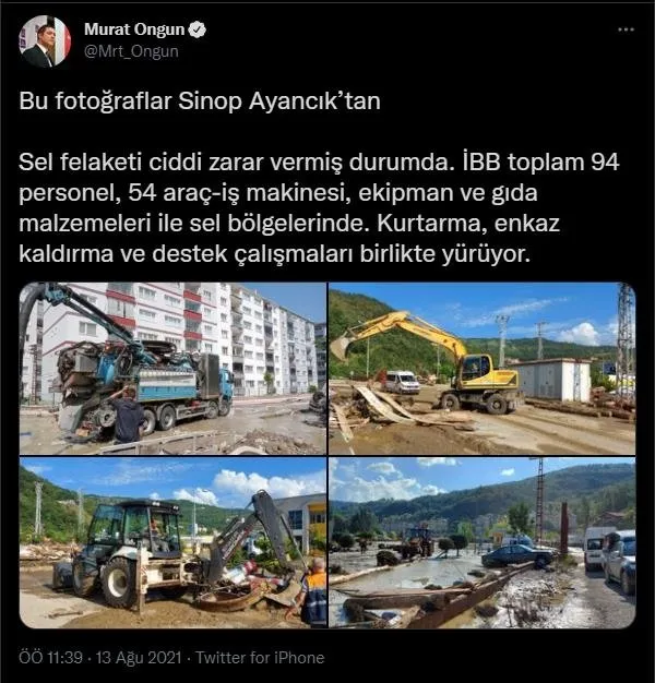 Ongun yaptığı paylaşımda “Sel felaketi ciddi zarar vermiş durumda. İBB toplam 94 personel, 54 araç-iş makinesi, ekipman ve gıda malzemeleri ile sel bölgelerinde. Kurtarma, enkaz kaldırma ve destek çalışmaları birlikte yürüyor.” dedi.