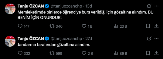 Tanju Özcan, X hesabından yaptığı paylaşımlarda “Jandarma tarafından gözaltına alındım”, “Memleketimde binlerce öğrenciye burs verildiği için gözaltına alındım. Bu benim için onurdur” ifadelerini kullandı.