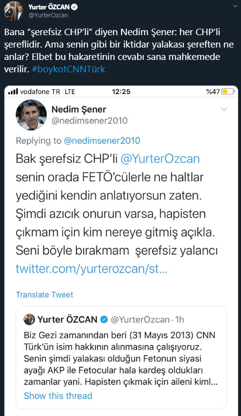 Nedim Şener, Yurter Özcan için, “Bak şerefsiz CHP’li Yurter Özcan, senin orada FETÖ’cülerle ne haltlar yediğini kendin anlatıyorsun zaten. Şimdi azıcık onurun varsa, hapisten çıkmam için kim nereye gitmiş açıkla. Seni böyle bırakmam şerefsiz yalancı” derken, Yurter Özcan da Şener’e, “İktidar yalakası, benden Türkçesini istediğin raporun 2009 Cumhuriyet gazetesi manşetiydi bu. Korku hafızana kötü gelmiş. Şerefsiz CHP’li hakaretinin bedelini de ödeyeceksin. Bunu unutma” ifadelerini kullandı.