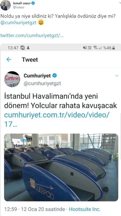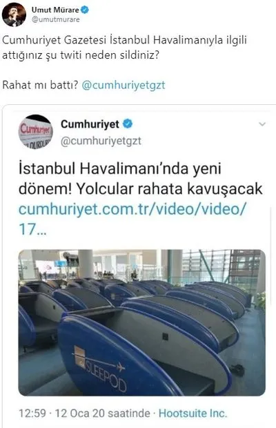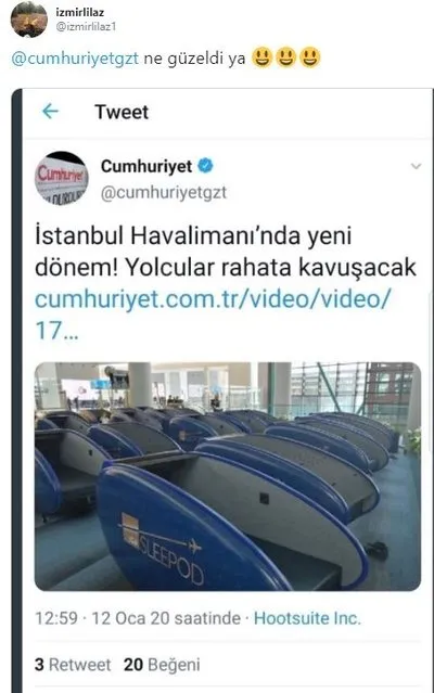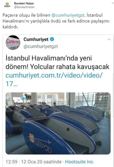 İstanbul Havalimanı’nda dış hatlarda bekleyen yolcuların dinlenebilmesi için kurulan “sleepod”ları haber yapan Cumhuriyet Gazetesi, yapılan yeniliği yanlışlıkla överek sosyal medyada paylaştı. “İstanbul Havalimanı’nda yeni dönem! Yolcular rahata kavuşacak” başlığıyla haberi Twitter’da duyuran Cumhuriyet Gazetesi, daha sonra apar topar bu paylaşımını sildi.
