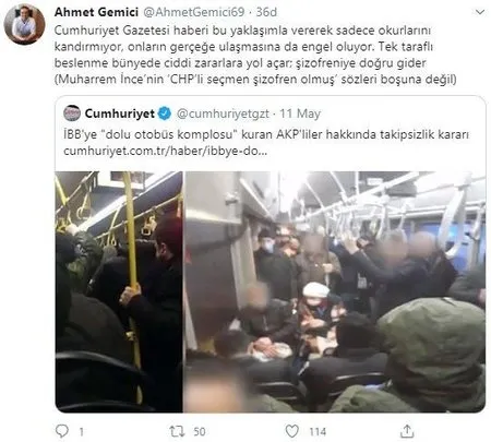 Cumhuriyet Gazetesi, savcılığın soruşturma ile ilgili kararını çarpıtarak “İBB’ye ‘dolu otobüs komplosu’ kuran AKP’liler hakkında takipsizlik kararı” başlıklı akıllara durgunluk veren bir haber servis ettiler.