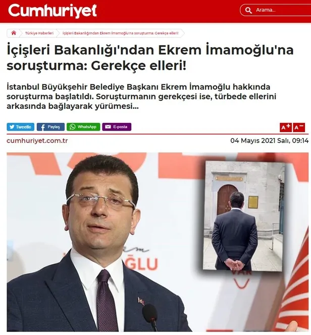 “4 Mayıs 2021 tarihli Cumhuriyet Gazetesinde; ‘İBB Başkanı Ekrem İmamoğlu’nun Fatih Sultan Mehmet Türbesinde elleri arkadan bağlanmış şekilde yürümesinin İçişleri Bakanlığını harekete geçirdiği, elleri arkasında gezdiği için hakkında soruşturma açıldığı ve Mülkiye Müfettişi tarafından ifadesinin istendiği’ şeklinde özetlenebilecek haberin yer alması üzerine, aşağıdaki açıklamanın yapılmasına gerek duyulmuştur.
