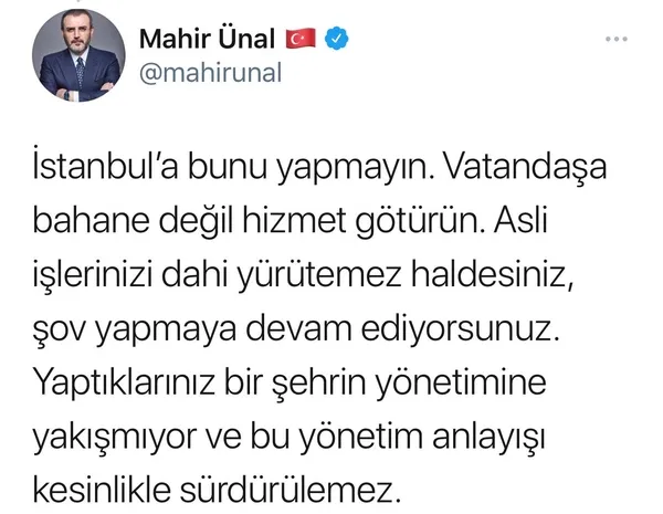 Cumhuriyet Halk Partisi (CHP) Genel Başkanı Kemal Kılıçdaroğlu “Her türlü engeli çıkartıyorlar. Belediye başkanlarımız her türlü engeli aşmak için azim ve kararlılığı göstereceklerdir” açıklamasını yapmıştı. AK Parti Genel Başkan Yardımcısı Mahir Ünal, CHP lideri Kılıçdaroğlu’nun bu sözlerini alıntılayarak sosyal medyadan açıklama yaptı. Ünal sosyal medya hesabından şunları söyledi: