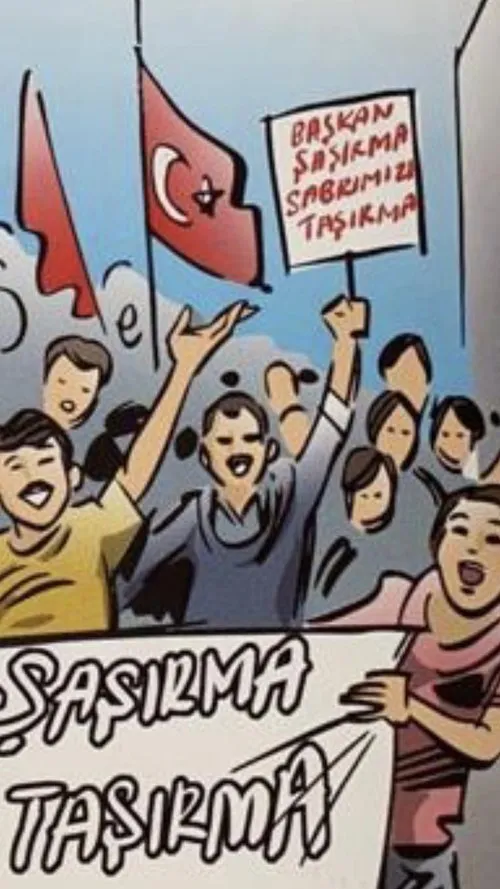 “Cumhuriyet ve Demokrasi” adlı kitapta, gençlerin “Başkan şaşırma, sabrımızı taşırma” ifadelerin yer aldığı pankart taşıması ve slogan atmaları resmedilmiş..