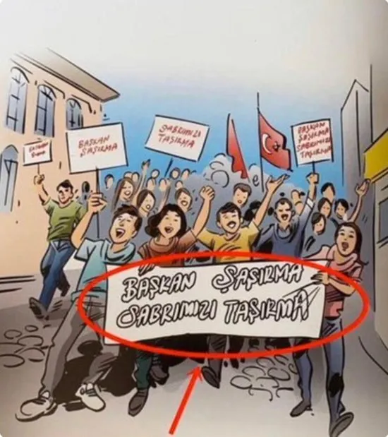 Söz konusu resimde; gençlerin ellerinde, “Başkan şaşırma”, “Sabrımızı taşırma” ve “Başkan şaşırma, sabrımızı taşırma” yazılı dövizler taşıması dikkat çekiyor. Söz konusu çizimde yer alan bir kişinin terörist başı Abdullah Öcalan’a benzediği iddia ediliyor..