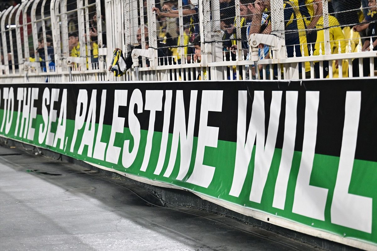 Fenerbahçe taraftarları, Nice ile oynanan UEFA Avrupa Ligi maçında Filistin halkı için tribünlerden mesaj yolladı..