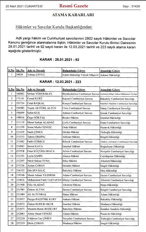 Adli yargı hakim ve Cumhuriyet savcılarının 2802 sayılı Hakimler ve Savcılar Kanunu gereğince atanmalarına ilişkin, Hakimler ve Savcılar Birinci Dairesinin 28.01.2021 tarihli ve 92 sayılı kararı ile 12.03.2021 tarihli 223 sayılı atama kararı Resmi Gazete’de yayımlandı.