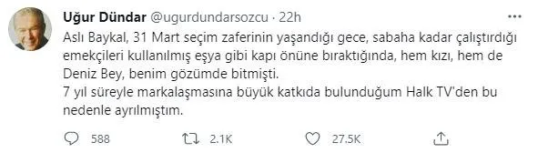 Dündar “Aslı Baykal, 31 Mart seçim zaferinin yaşandığı gece, sabaha kadar çalıştırdığı emekçileri kullanılmış eşya gibi kapı önüne bıraktığında, hem kızı, hem de Deniz Bey, benim gözümde bitmişti.