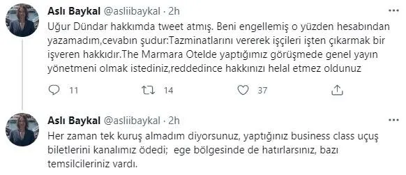 Son dönemde adı kara paralarla anılan Uğur Dündar’a Aslı Baykal cevap verdi. Uğur Dündar’ın kendisini sosyal medya hesabından engellediğini belirten Aslı Baykal, “The Marmara Otelde yaptığımız görüşmede genel yayın yönetmeni olmak istediniz,reddedince hakkınızı helal etmez oldunuz. Her zaman tek kuruş almadım diyorsunuz, yaptığınız business class uçuş biletlerini kanalımız ödedi; ege bölgesinde de hatırlarsınız, bazı temsilcileriniz vardı.”