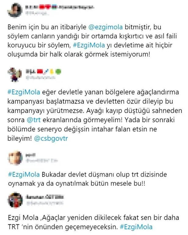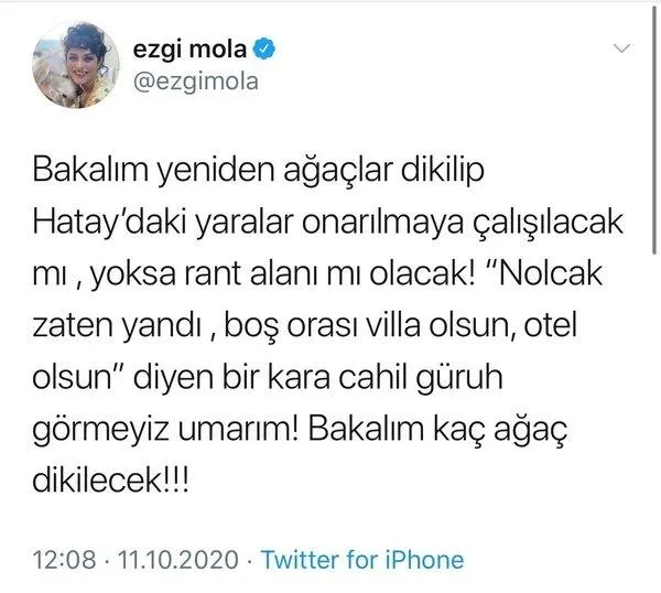 Muhalif medyanın ortaya attığı kimi yalan haberlerden etkilenen Ezgi Mola ikinci iletisinde ise çekinceli bir ileti attı. Mola, “Bakalım yeniden ağaçlar dikilip Hatay’daki yaralar onarılmaya çalışılacak mı, yoksa rant alanı mı olacak! ‘Nolcak zaten yandı, boş orası villa olsun, otel olsun’ diyen bir kara cahil güruh görmeyiz umarım! Bakalım kaç ağaç dikilecek!” dedi.