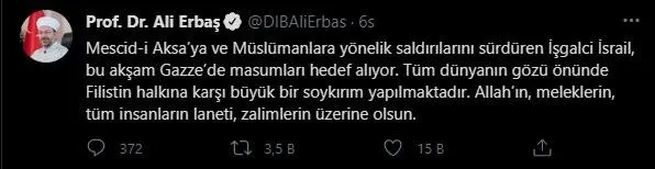 Diyanet İşleri Başkanı Erbaş, Twitterdan yaptığı açıklamada “Mescid-i Aksa’ya ve Müslümanlara yönelik saldırılarını sürdüren İşgalci İsrail, bu akşam Gazze’de masumları hedef alıyor. Tüm dünyanın gözü önünde Filistin halkına karşı büyük bir soykırım yapılmaktadır. Allah’ın, meleklerin, tüm insanların laneti, zalimlerin üzerine olsun” dedi.