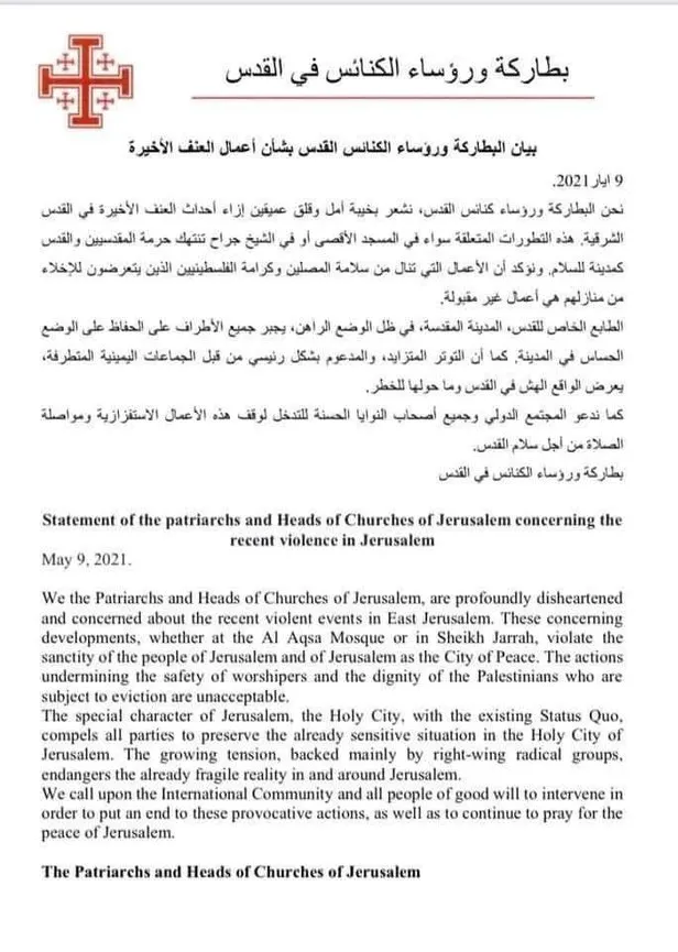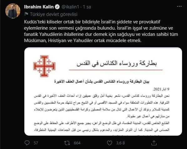 Kalın, sosyal medya hesabından yaptığı açıklamada, Kudüs’teki kiliselerin, ortak bir bildiriyle İsrail’in şiddete ve provokatif eylemlerine son vermesi çağrısında bulunduğunu belirterek, kiliselerin ortak bildirisini paylaştı.