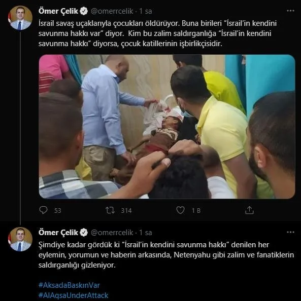 AK Parti Sözcüsü Ömer Çelik, “İsrail savaş uçaklarıyla çocukları öldürüyor. Kim bu zalim saldırganlığa ‘İsrail’in kendini savunma hakkı’ diyorsa, çocuk katillerinin işbirlikçisidir” dedi.