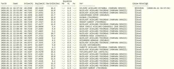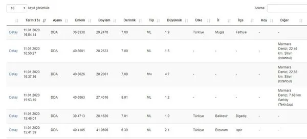 11 Ocak öğle saatlerinde İstanbul’da deprem korkutan bir deprem meydana geldi. Kandilli Rasathanesi tarafından, yaşanan depremin büyüklüğü 4.8 olarak açıklandı. İstanbul’daki depremin, tam olarak saat 16:37:36’da, yerin 16.2 kilometre derinliğinde meydana geldiği bildirildi. İstanbul Silivri açıklarında yaşanan deprem büyük korku ve paniğe neden olurken, birçok vatandaş kendini sokağa attı. İstanbul Valiliği ve AFAD’dan da korkutan deprem ile ilgili peş peşe açıklamalar yapıldı. İşte 11 Ocak Kandilli Rasathanesi ve AFAD’dan alınan bilgilere göre son depremler listesi!