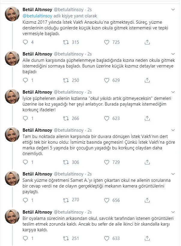 “Ben Betül Altınsoy. İstek Vakfı’na ait bir anaokulunda cinsel istismara uğramış 5 yaşında bir çocuğun avukatıyım. Sizden duyurmanızı istediğim bir ricam var.. Kızımız 2017 yılında İstek Vakfı Anaokulu’na gitmekteydi. Süreç, yüzme derslerinin olduğu günlerde küçük kızın okula gitmek istememesi ve tepki vermesiyle başladı.Aile durum karşısında şüphelenmeye başladığında kızına neden okula gitmek istemediğini sormaya başladı. Bunun üzerine küçük kızımız detaylar vermeye başladı. İyice şüphelenen ailenin kızlarına “okul yıkıldı artık gitmeyeceksin” demeleri üzerine ise kız yaşadığı her şeyi anlatıyor. Burada paylaşmak istemediğim korkunç ifadeler!