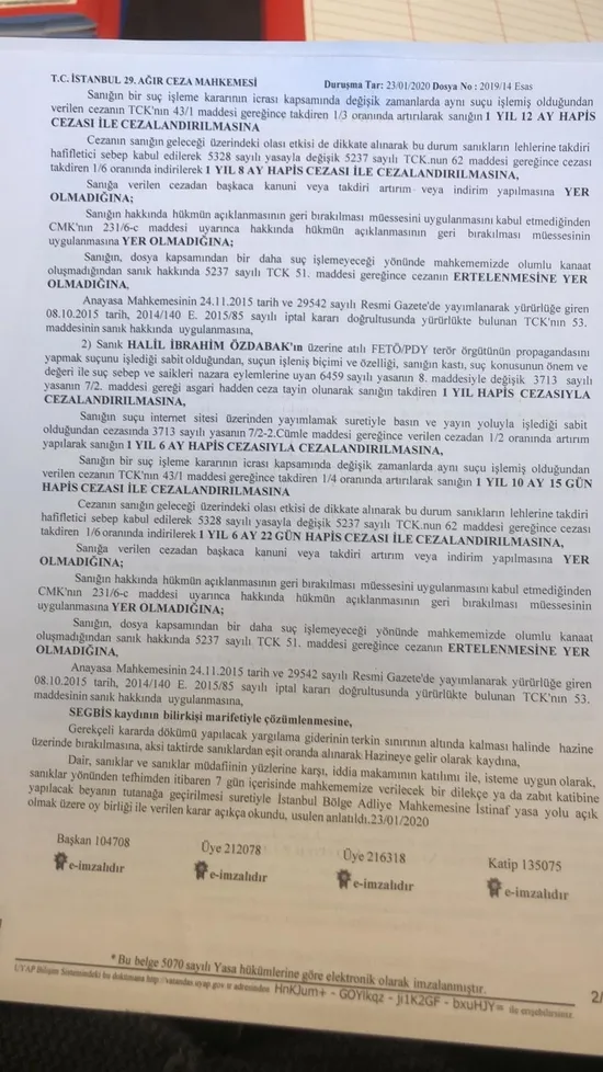İstanbul 29. Ağır Ceza Mahkemesi, FETÖ’nün kripto gazetesi YeniAsya’nın Genel Yayın Yönetmeni Kazım Güleçyüz’e “Terör örgütü propagandası” iddiasıyla açılan davada 1 yıl 8 ay, Sorumlu Yazı İşleri Müdürü İbrahim Özdabak’a ise 1 yıl 6 ay 22 gün hapis cezasına hükmetti.
