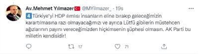 ‘Türkiye’yi HDP ılımlısı insanların eline bırakıp geleceğimizin karartılmasına razı olmayacağımızı ve ayrıca Lütfü gibilerin müstehcen ağızlarının payını vereceğimizden hiçkimsenin şüphesi olmasın. AK Parti bu milletin kendisidir!’