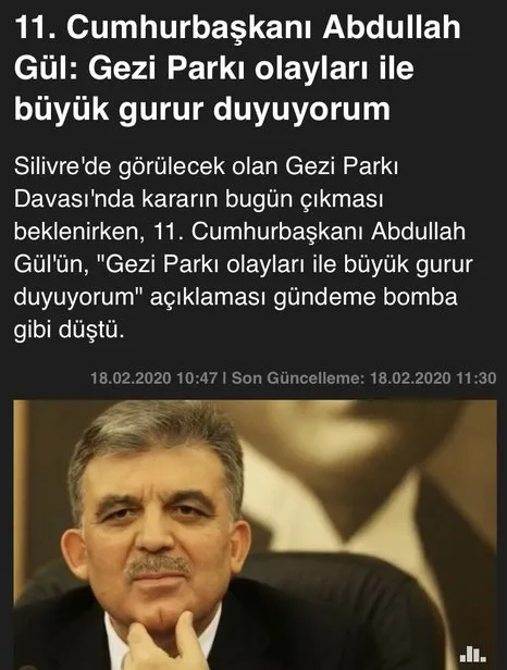 Bu arada daha önce 2007 yılında benzer bir operasyonla (Cumhuriyet mitingleri) Cumhurbaşkanlığı adaylığı engellenmek istenen Abdullah Gül’ün Gezi Mahkemesi öncesi ihsası reyi de ibretlik olarak tarihe geçti.