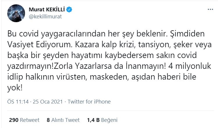 “Bu covid yaygaracılarından her şey beklenir. Şimdiden Vasiyet Ediyorum. Kazara kalp krizi, tansiyon, şeker veya başka bir şeyden hayatımı kaybedersem sakın covid yazdırmayın!Zorla Yazarlarsa da İnanmayın! 4 milyonluk idlip halkının virüsten, maskeden, aşıdan haberi bile yok!”
