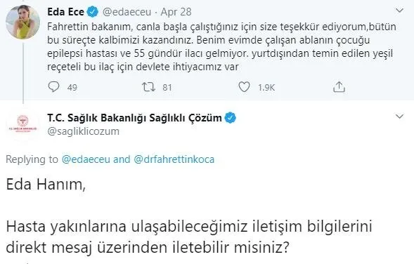 Sağlık Bakanlığı’nın hızlı geri dönüşü sonrası Ece bir paylaşım daha yaparken şu sözlerle teşekkür etti: “Hızlı cevabınız için sağlıklı çözüm yürekten teşekkür ederim. Ve bu tweetin görülmesi için paylaşan buradaki insanlara da teşekkür ederim. Umarım bir an önce hallolur.”