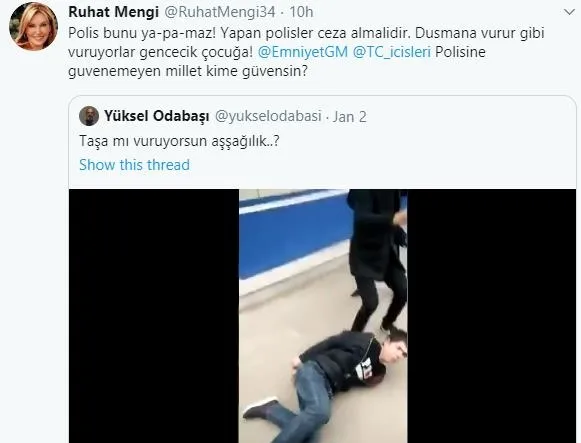 Türk polisini karalamak için videodakilerin Türk polisi olduğunu iddia eden gazeteci Ruhat Mengi, sosyal medya hesabından Emniyet Genel Müdürlüğü ve İçişleri Bakanlığını etiketleyerek “Polis bunu yapamaz! Yapan polisler ceza almalıdır. Düşmana vurur gibi vuruyorlar gencecik çocuğa. Polisine güvenemeyen millet kime güvensin” paylaşımında bulundu.