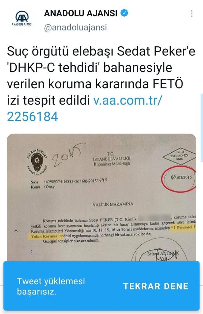 Skandallar silsilesi genişliyor!. Anadolu Ajansı FETÖ tarafından Sedat Peker’e koruma kararı verilen belge haberini sitesinden kaldırdı!.