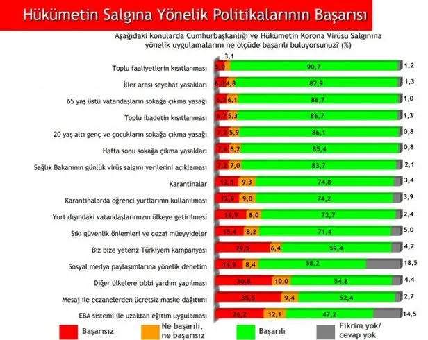 Katılımcılara, “Cumhurbaşkanlığı ve hükumetin koronavirüs salgınına yönelik uygulamalarını ne ölçüde başarılı buluyorsunuz?” sorusu yöneltildi. Uygulamaları değerlendiren katılımcıların yüzde 90,7’si “toplu faaliyetlerin kısıtlanması”nı en başarılı uygulama olarak gördü. İkinci sırada yüzde 87,9 ile “iller arası seyahat yasakları”, üçüncü sırada ise yüzde 86,7 ile “65 yaş ve üstü vatandaşların sokağa çıkma yasağı” sıralandı.