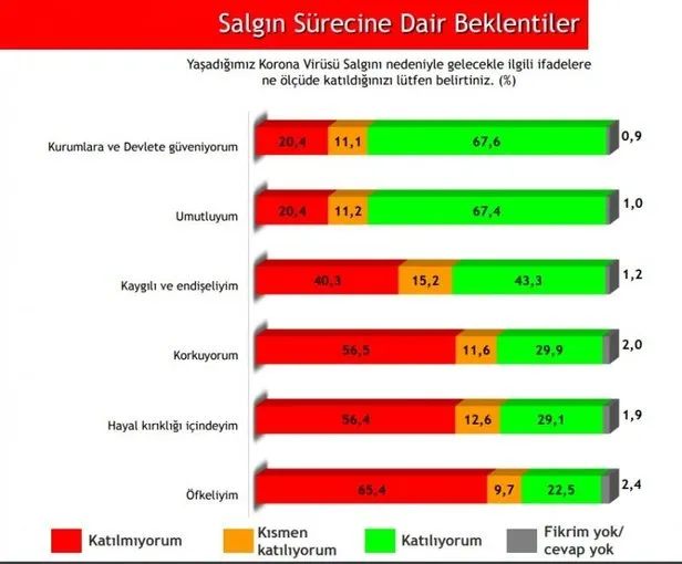 Gelecekle ilgili beklentilerine dair sorular yöneltilen katılımcılardan “kurumlara ve devlete güveniyorum” diyenlerin oranı yüzde 67,6 oldu. “Umutluyum” ifadesine katılanların oranı yüzde 67,4, “kaygılı ve endişeliyim” ifadesine katılanların oranı ise yüzde 43,3 olarak gerçekleşti.
