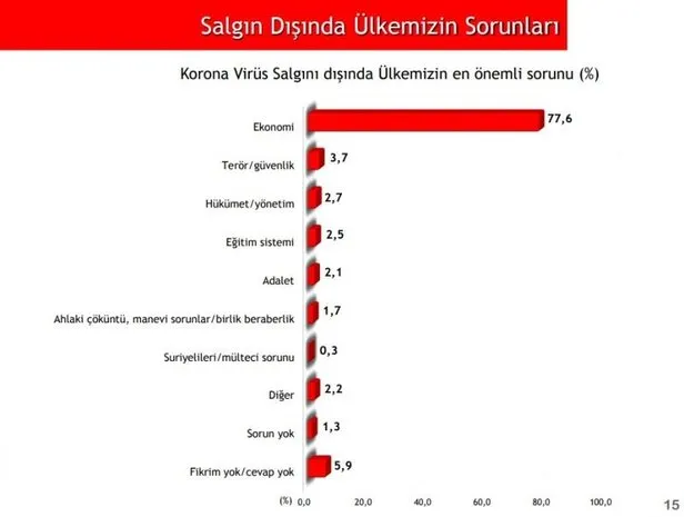 Katılımcıların yüzde 77,6’sı “Size göre koronavirüs salgını dışında ülkemizin en önemli sorunu nedir?” sorusuna “ekonomi” yanıtını verdi. İkinci sırada yüzde 3,7 oranıyla “terör/güvenlik”, üçüncü sırada yüzde 2,7 oranıyla “hükümet/yönetim” cevabı verildi.