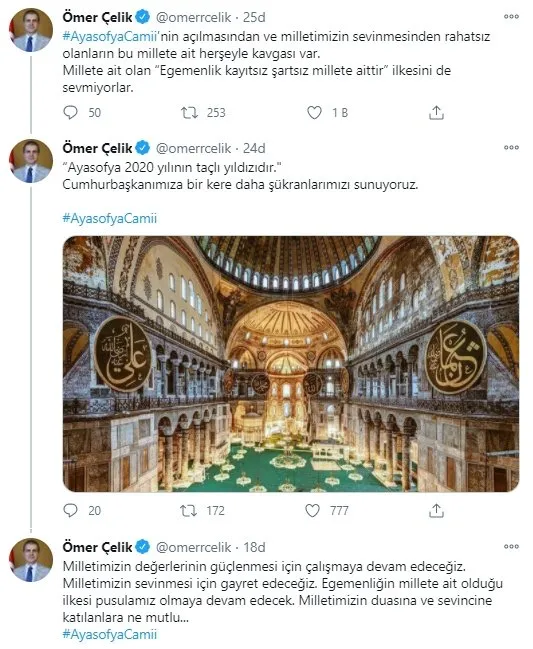 Çelik, Ayasofya-i Kebir Cami-i Şerifi’nin fotoğrafını paylaşarak, “Ayasofya Camii’nin açılmasından ve milletimizin sevinmesinden rahatsız olanların bu millete ait her şeyle kavgası var. Millete ait olan ‘Egemenlik kayıtsız şartsız millete aittir’ ilkesini de sevmiyorlar. Ayasofya 2020 yılının taçlı yıldızıdır. Cumhurbaşkanımıza bir kere daha şükranlarımızı sunuyoruz. Milletimizin değerlerinin güçlenmesi için çalışmaya devam edeceğiz. Milletimizin sevinmesi için gayret edeceğiz. Egemenliğin millete ait olduğu ilkesi pusulamız olmaya devam edecek. Milletimizin duasına ve sevincine katılanlara ne mutlu” ifadelerini kullandı.