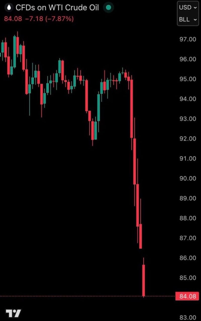 Brent petrolün varil fiyatı uluslararası piyasalarda 114 doları aştıktan sonra ABD Başkanı Donald Trump’ın savaşın yakında sona erebileceğini açıklamasının da etkisiyle 84 dolar seviyesine geriledi.