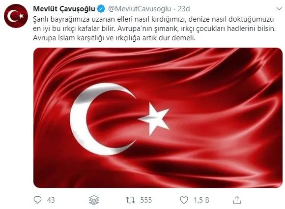 “Şanlı bayrağımıza uzanan elleri nasıl kırdığımızı, denize nasıl döktüğümüzü en iyi bu ırkçı kafalar bilir. Avrupa’nın şımarık, ırkçı çocukları hadlerini bilsin. Avrupa İslam karşıtlığı ve ırkçılığa artık dur demeli.”